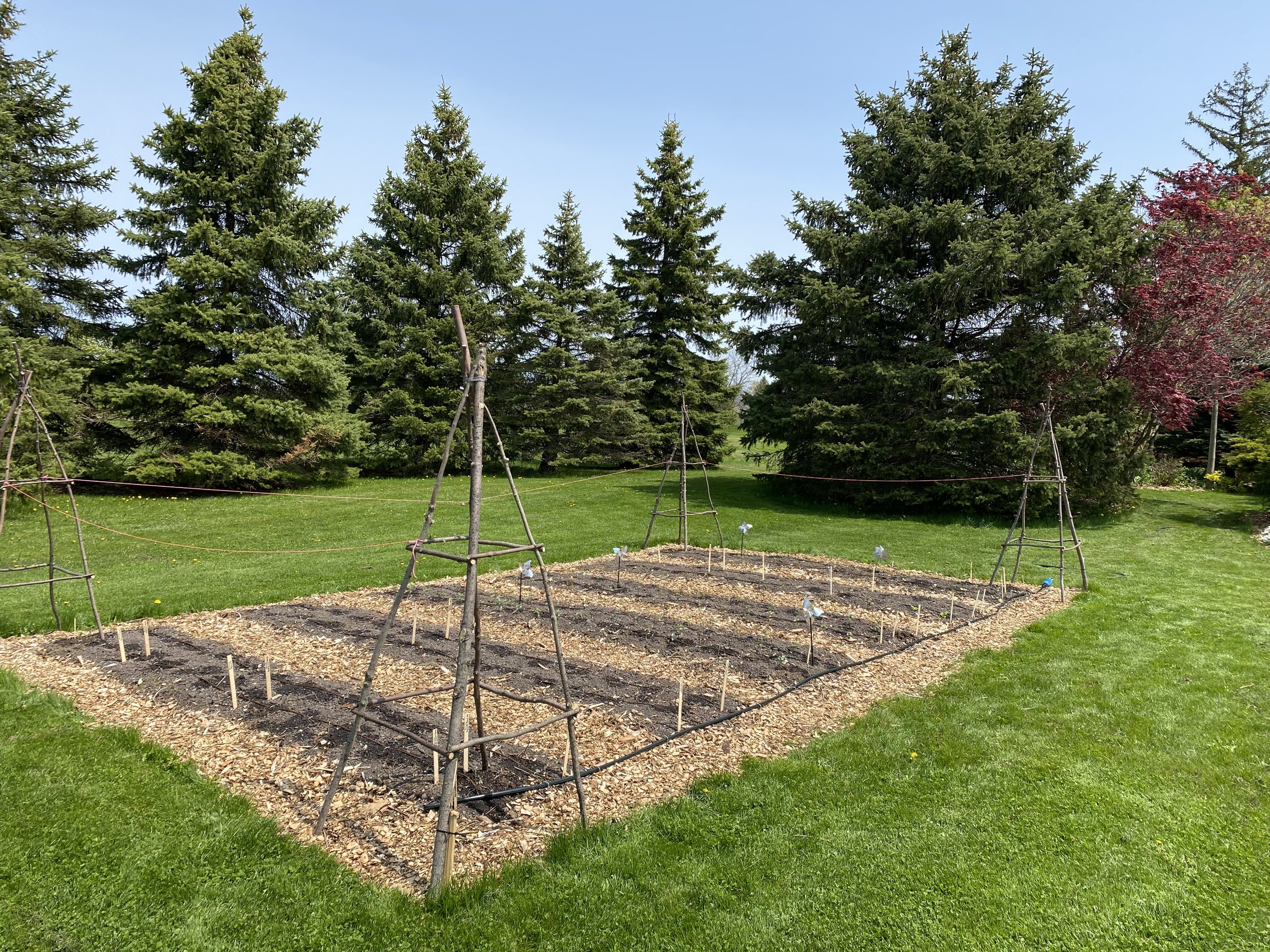 There are 6 x 3’ flower rows with a walkway in between each, all lined with corrugated cardboard and wood chips. We had our willow trees trimmed this year and kept the wood chips for mulch!